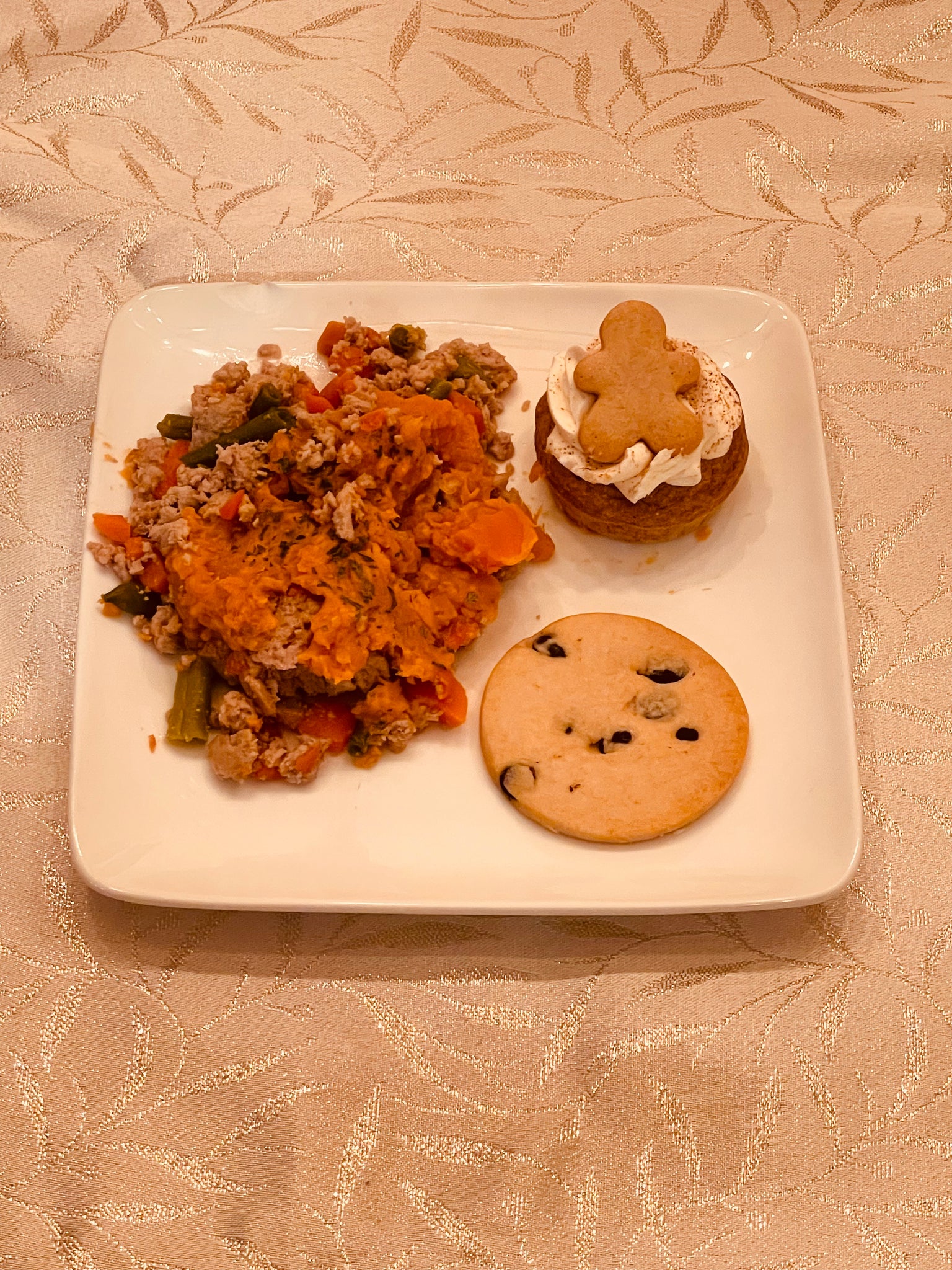 Shepherds pie:  Lean turkey, green beans, peas and carrots topped with about a half cup of pureed sweet potato. (~1.5 cups food)