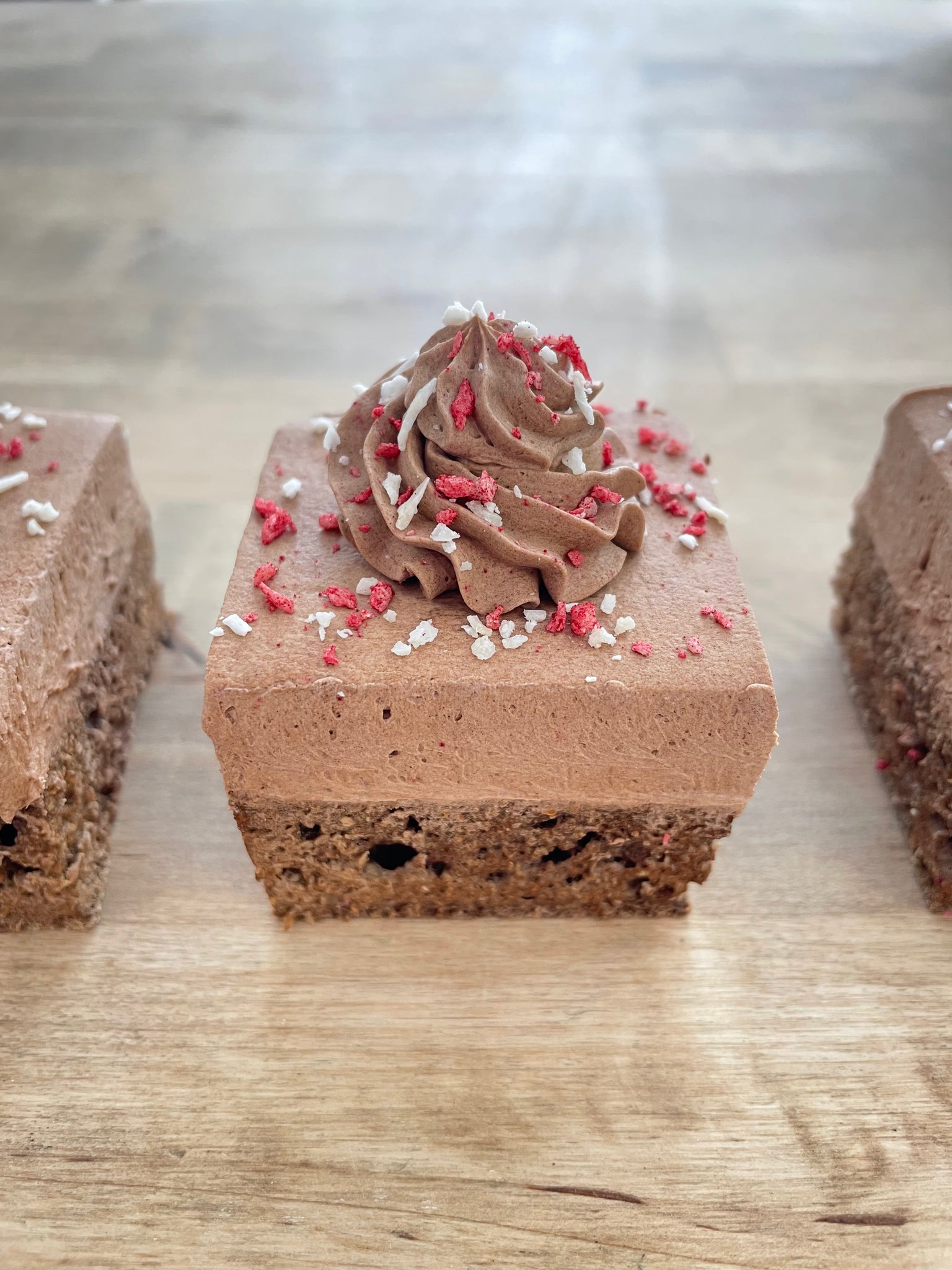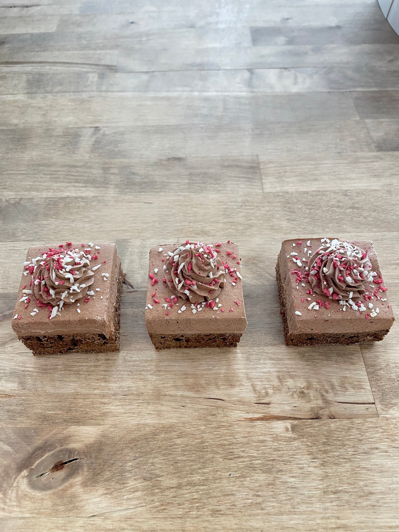 This very soft brownie is sure to make your dog wild! Each brownie is decorated with a carob frosting swirl, plain and beet tinted coconut. 2" x 2" square.