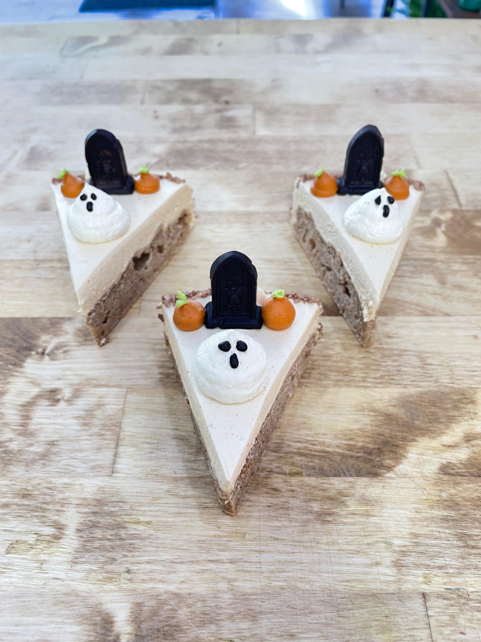 Peanut butter cake slice with some spooky cute decorations! Carob drizzle topped with pumpkins and a lil ghostie.
