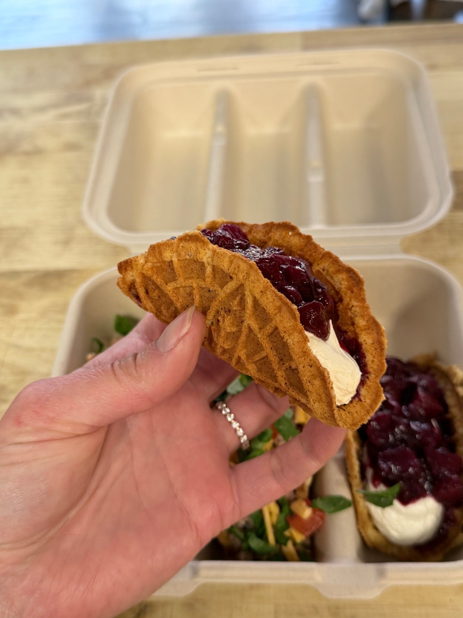 Ingredients: whole wheat flour, honey, egg, turkey, cheese, bell pepper, buttermilk, strawberry, blueberry.